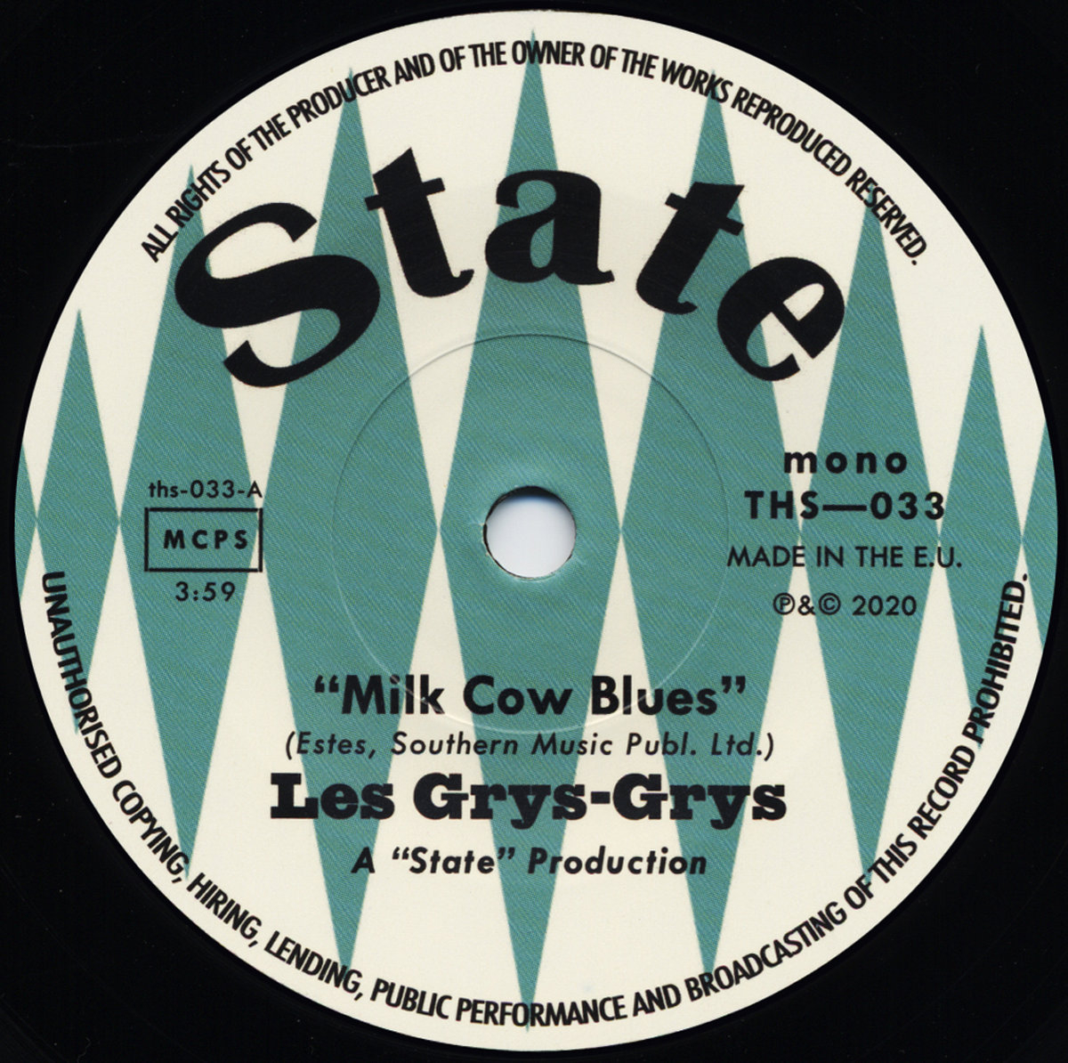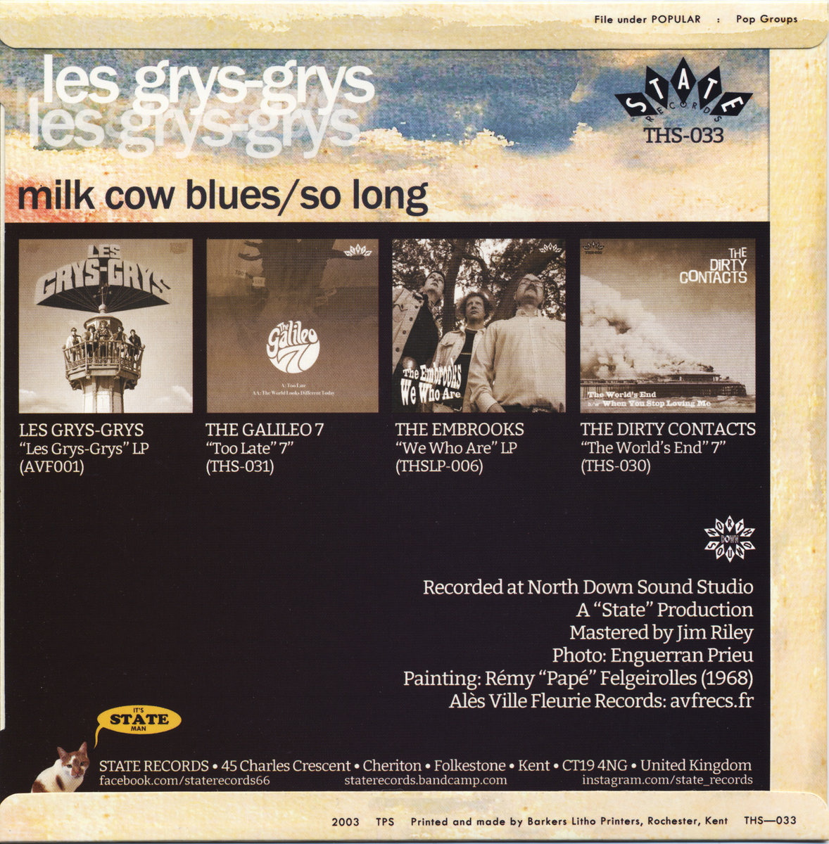 French garage/R & B deviants LES GRYS-GRYS follow up their debut LP from last year with 2 more kick-ass tracks, recently laid down at State's custom-built North Down Sound 8-track recording facility. They've finally committed their 'signature' tune 'Milk Cow Blues' to tape, with an aggressive delivery to match their live performance. Original flipside 'So Long' is equally monstrous, with a powerful swing and some stinging guitar. Both sides appear in dedicated mono mixes, as all good 45s should!